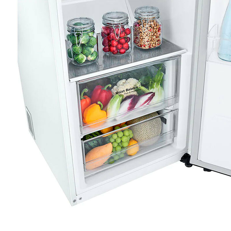 Frigorífico una puerta LG GLT51SWGSZ en acabado blanco con 386 L de capacidad total y eficiencia energética clase E. Incorpora DoorCooling+ y compresor Smart Inverter para un enfriamiento rápido y uniforme, iluminación LED interior, cajones Magic Crisper y puerta reversible para instalación libre.