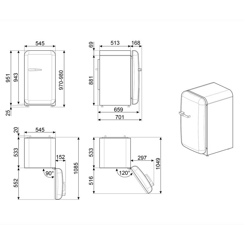 Frigorífico monopuerta Smeg FAB10RPB6 en acabado azul 50's Style y libre instalación. Ofrece 122 L netos (105 L frigorífico + 17 L congelador), refrigeración estática, luz interior LED y bisagra derecha. Clase energética D y consumo anual 115 kWh, nivel sonoro 35 dB y autonomía 6 h, ideal para espacios reducidos que buscan diseño retro y funcionalidad fiable.