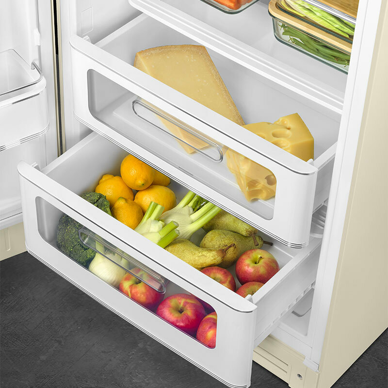 Frigorífico monopuerta de estilo 50's Smeg FAB28LCR6 en color crema que ofrece 270 L de capacidad total y tecnología Inverter con sistema Multiflow para una distribución uniforme del frío. Incorpora cajón LifePlus 0°C, iluminación LED, alarma de puerta y bajo nivel sonoro de 35 dB. Eficiencia energética clase C y autonomía de 9 h ante cortes.