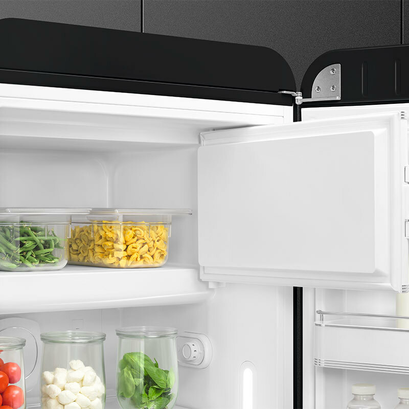 Frigorífico retro Smeg FAB28RBL6 de libre instalación diseñado en estilo 50's con acabado negro brillante y tirador cromado. Ofrece 270 L de capacidad total, iluminación LED interior, sistema Multiflow con ventilador y compresor inverter para funcionamiento silencioso y eficiente. Incluye cajón LifePlus 0°C y pequeño compartimento congelador interior de 4 estrellas para conservación y congelación puntual.