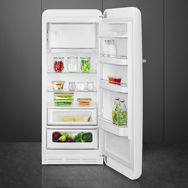Frigorífico de una puerta Smeg FAB28RWH6 en acabado blanco de estilo 50's, capacidad total de 270 L (244 L frigorífico y 26 L congelador). Equipado con compresor inverter, sistema Multiflow ventilado, iluminación LED y cajón LifePlus 0°C para conservación prolongada. Eficiencia energética clase C con consumo anual de 104 kWh y bajo nivel sonoro de 35 dB, diseño exterior cromado y apertura con bisagra derecha para instalación libre.