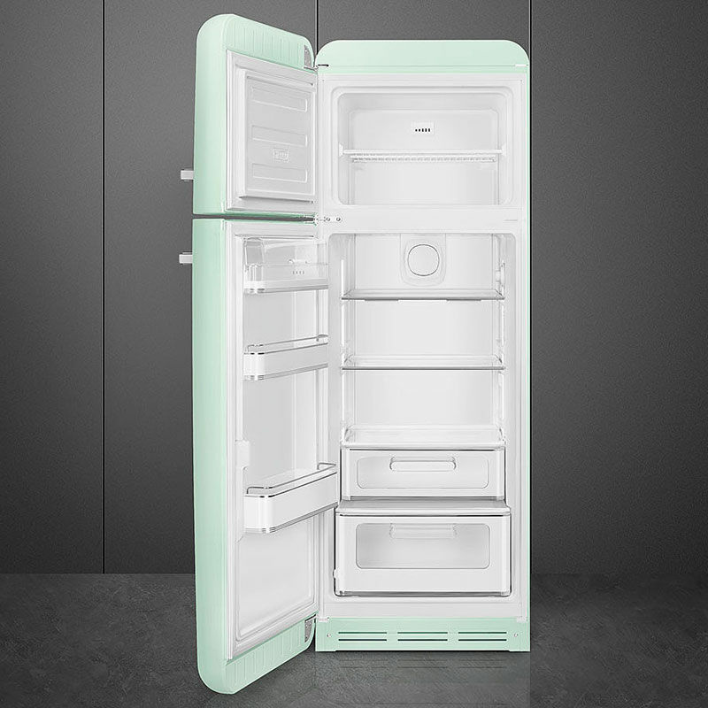 Frigorífico retro de 2 puertas Smeg FAB30LPG5 en color Verde agua que combina el diseño años 50 con tecnología moderna. Cuenta con 294 L útiles (222 L frigorífico y 72 L congelador), compresor Inverter, sistema ventilado Multiflow, iluminación LED, eficiencia energética clase D, bajo nivel sonoro y autonomía de 30 horas.