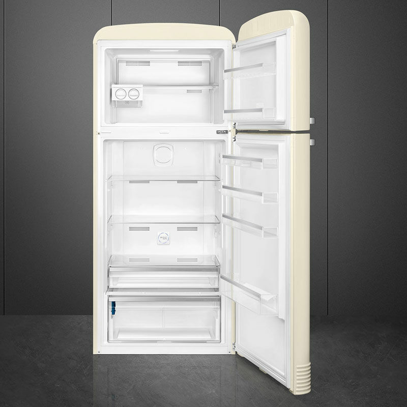 Frigorífico Smeg FAB50RCR5 en color crema con estética 50's que combina diseño y funcionalidad. Dispone de 524 L de capacidad total, sistema Total No Frost con doble circuito y compresor inverter para conservación eficiente y bajo ruido, iluminación LED, fabricador manual de cubitos y alarma de puerta.