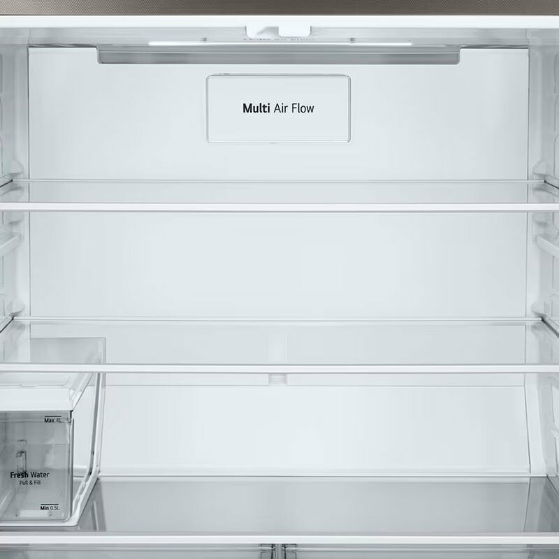 Frigorífico americano LG GML861PYPE de 506 L en acabado inox antihuellas, diseñado para una conservación óptima con tecnología Total No Frost y Linear Cooling. Incorpora dispensador de agua y hielo con depósito interno y UVnano, conectividad ThinQ, iluminación LED y compresor inverter de bajo ruido.