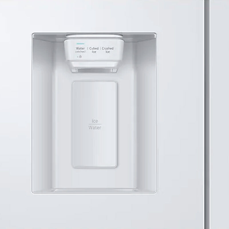 Frigorífico americano Samsung RS68A8831WW/EF Blanco de 634 L con tecnología Twin Cooling Plus y SpaceMax que proporciona refrigeración No Frost, dispensador integrado de agua y hielo y compresor Digital Inverter con 20 años de garantía. Clase E, consumo 351 kWh/año y bajo nivel sonoro para conservación eficiente.