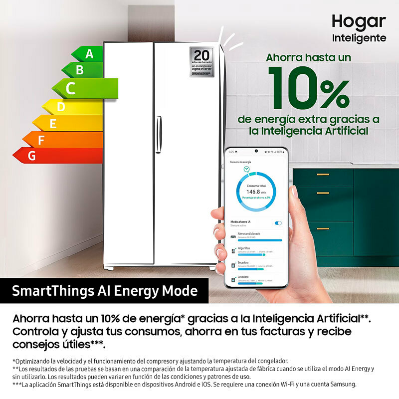 Frigorífico americano Samsung RS80F66KCTEF en acabado inox de 634 L brutos que combina Twin Cooling y Metal Cooling para una temperatura homogénea y conservación óptima. Dispone de dispensador integrado de agua y hielo y cubitera automática, compresor AI Inverter eficiente, conectividad WiFi y gestión SmartThings, clase energética C y bajo nivel sonoro.