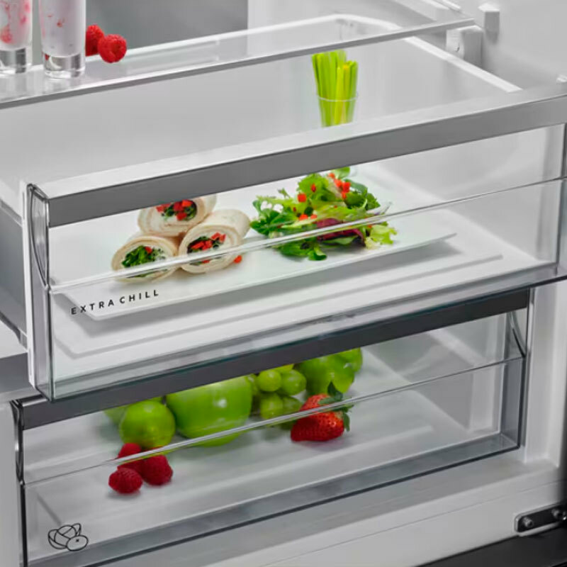 Frigorífico combi de libre instalación AEG ORC8M361EE en acabado cristal negro que combina tecnología TwinTech Total No Frost y Cooling 360° para una distribución homogénea del frío y conservación óptima de los alimentos. Dispone de 366 L de capacidad total, cajón ExtraChill, iluminación LED y display interior, eficiencia energética clase E y nivel sonoro reducido de 38 dB.