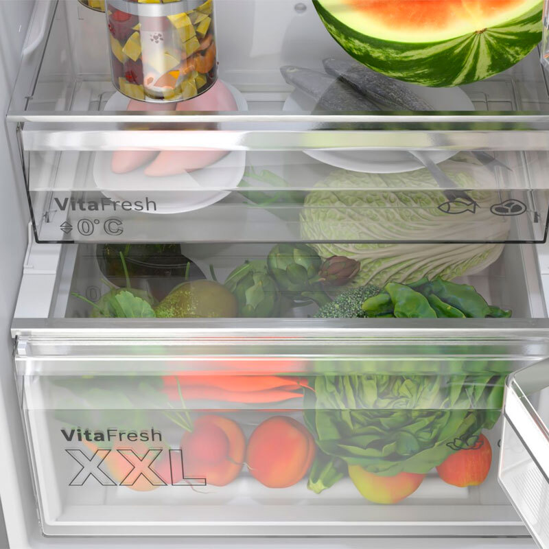 Frigorífico combi Bosch KGN362ICF en acabado acero inoxidable antihuellas con 321 L de capacidad útil (218 L frigorífico y 103 L congelador). Incorpora Total No Frost, cajón VitaFresh XXL, MultiAirflow e iluminación LED para conservación uniforme, consumo anual 159 kWh y 35 dB de ruido, diseñado para un rendimiento eficiente y sin necesidad de descongelado manual.