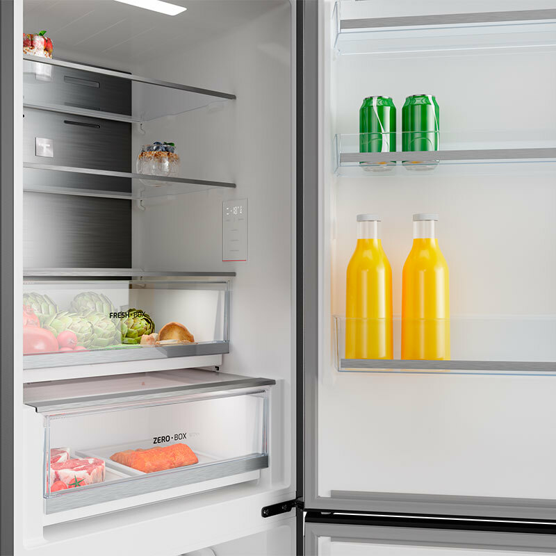 Frigorífico combi Teka RBF 64660 SS en acero inoxidable con 334 L de capacidad total y sistema Total No Frost que evita la escarcha. Incorpora motor Inverter, control DualTemp y MetalCooling para temperaturas homogéneas, cajones FreshBox y ZeroBox, iluminación LED, clase energética C y nivel sonoro de 35 dB.