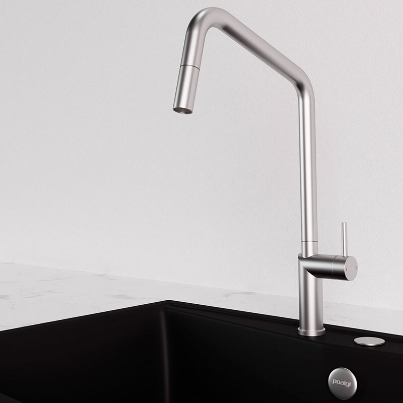 Grifo de cocina Poalgi POALGIC1/NQ – Níquel cepillado, Ducha extraíble, Ahorro de agua