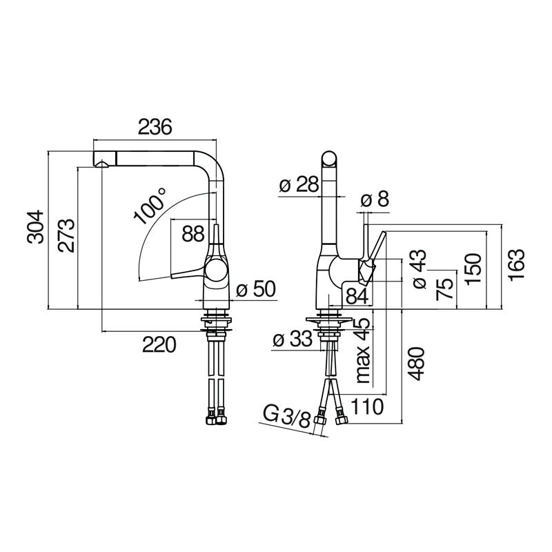 Grifo monomando de cocina Poalgi Nobili CU128113WM en blanco mate. Incorpora cartucho de doble posición con limitador de caudal 50%, caño giratorio 180° adaptable, aireador anticalcáreo M24x1 y flexibles inox 3/8 para encimera. Altura 304 mm y caída 273 mm que aseguran funcionalidad, ahorro y durabilidad.
