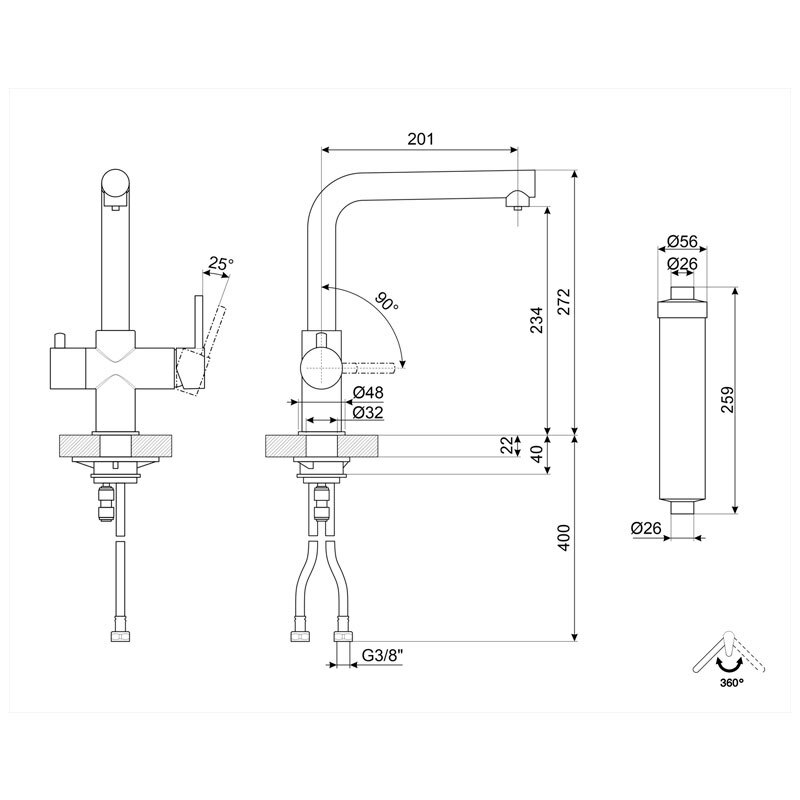 Grifo de cocina Smeg MAP99CR en acabado cromo brillante diseñado para suministrar agua caliente, fría y filtrada desde un único punto mediante mandos independientes. Fabricado en latón con caño giratorio 360°, cartucho cerámico Ø35 mm, sistema Energy Saving Cartridge y filtro FIAP 16007 de 1.100 L que garantizan eficiencia, seguridad y ahorro energético en instalación de encimera.