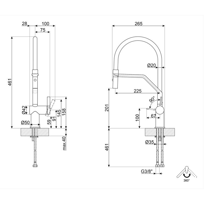 Grifo de cocina Smeg MID20CR negro mate con detalles cromados y estética semiprofesional. Monomando que ofrece control preciso, caño alto giratorio 360° y ducha móvil semiprofesional de doble chorro para mayor versatilidad. Fabricado en latón con cartucho cerámico Ø35 mm, incluye 2 mangueras flexibles de 450 mm y conexión 3/8, instalación en un orificio.