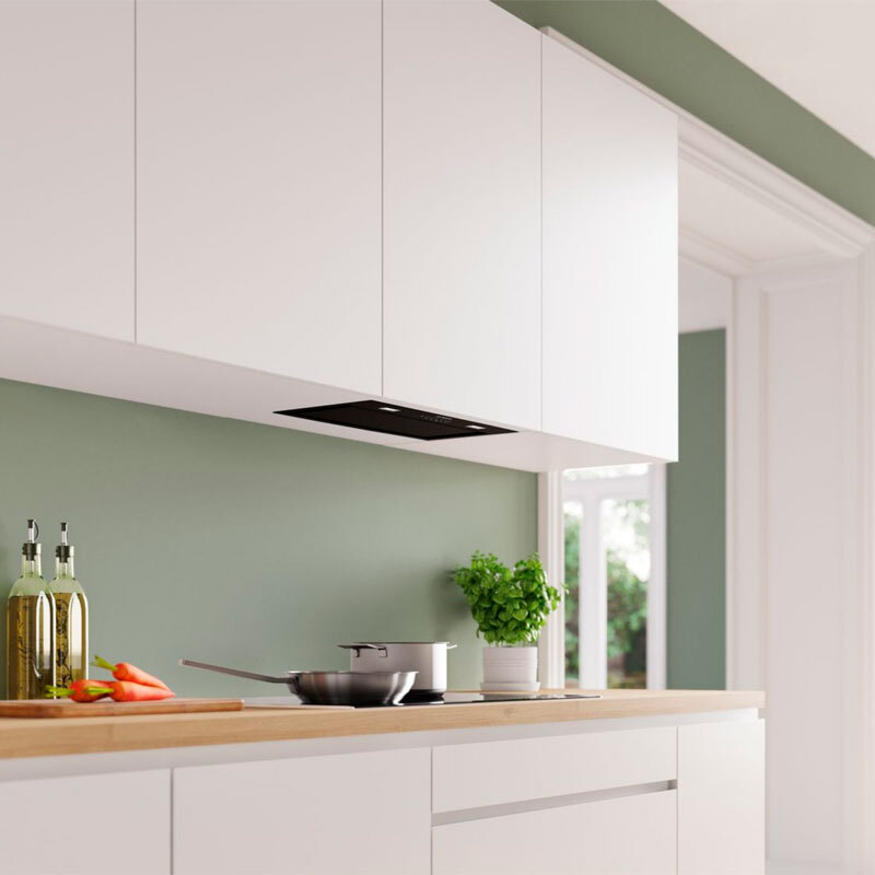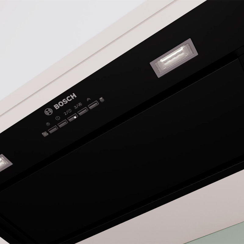 Grupo filtrante integrable Bosch DLN57PC60 en acabado negro cristal diseñado para integración en mueble alto. Ofrece extracción máxima de 555 m³/h y modo intensivo de 755 m³/h, iluminación LED, filtro antigrasa lavable en lavavajillas y control por pulsadores, combinando rendimiento silencioso y diseño discreto.