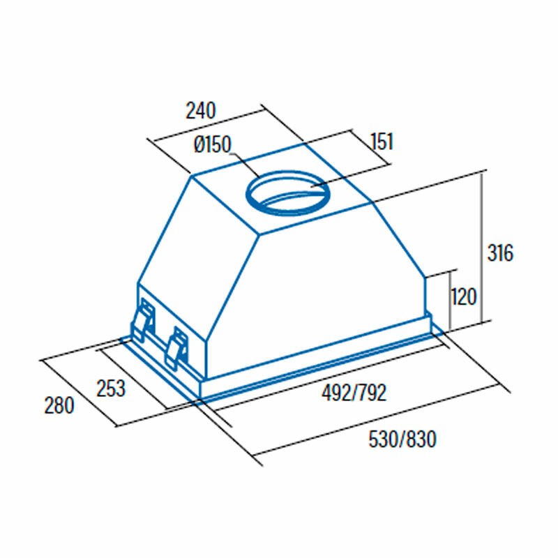Grupo filtrante Cata GCX 83 SD en acabado gris diseñado para integración y extracción mixta. Ofrece hasta 750 m³/h en modo turbo, funcionamiento silencioso y eficiencia energética clase A. Incorpora control táctil, iluminación LED bicolor, filtro de aluminio lavable en lavavajillas y temporizador para mayor confort de uso.