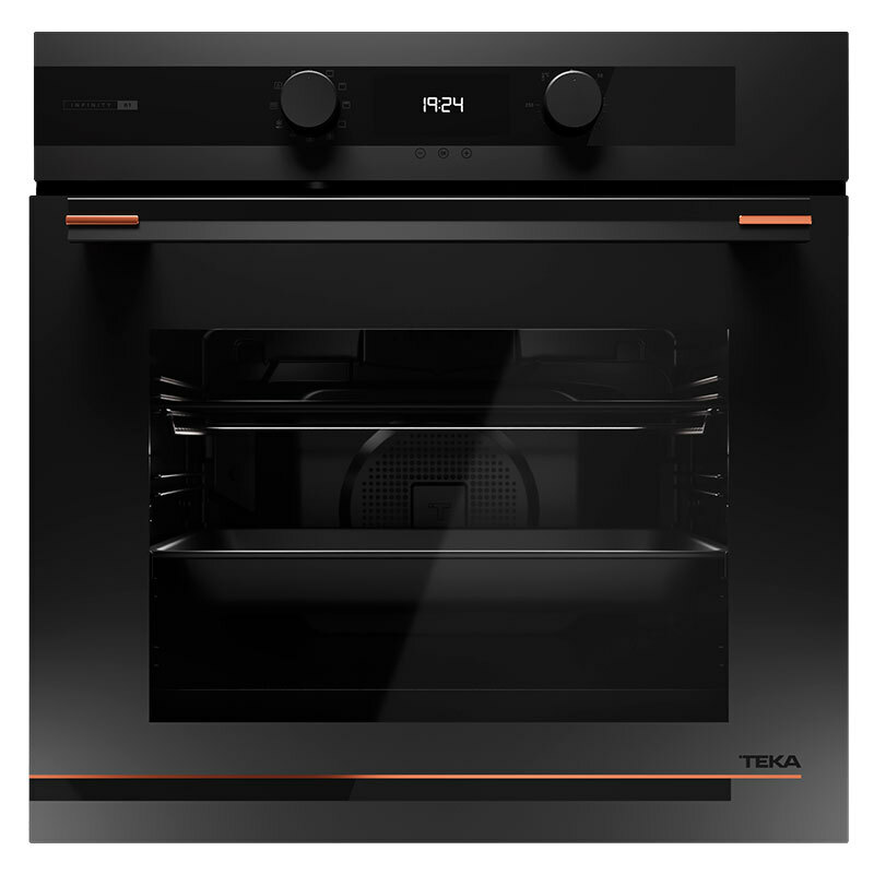 Horno integrable pirolítico Teka HLB84G1PBM en acabado negro mate diseñado por Italdesign Giugiaro. Capacidad de 70 L y 8 funciones SurroundTemp con programación táctil y guías telescópicas Plus-Extension. Sistema DualClean con pirólisis y HydroClean PRO, clase A+ y puerta de cuatro cristales para mayor seguridad y confort de uso.