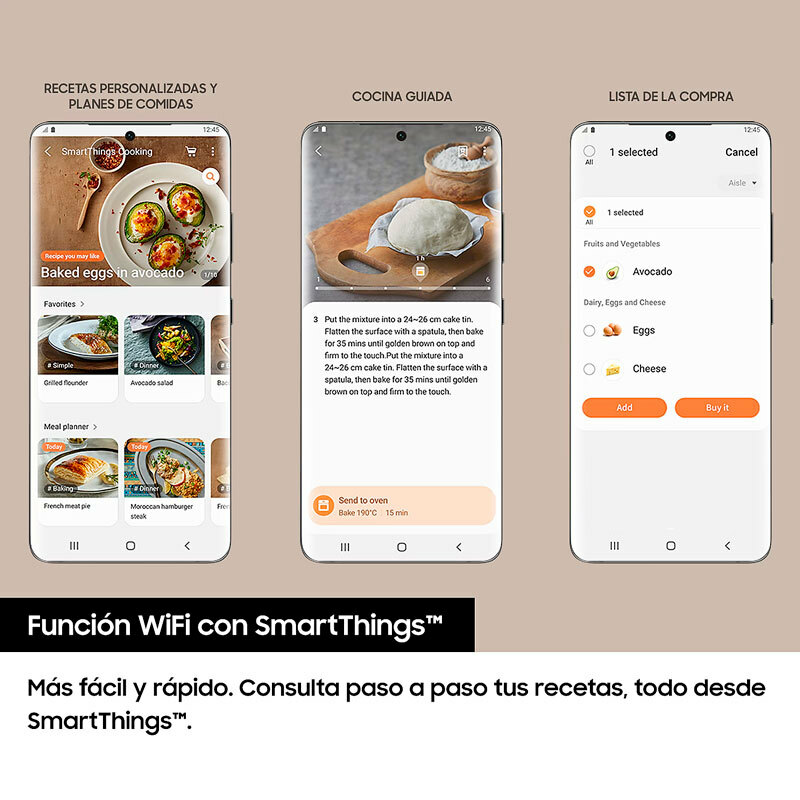 Horno pirolítico Dual Cook de 76 litros con limpieza pirolítica y conectividad Wi‑Fi SmartThings que permite control remoto y programas automáticos. Ofrece doble zona independiente (Dual Cook), función Air Sous Vide, raíl telescópico para extracción fácil y puerta de cuatro cristales para mayor aislamiento térmico. Clase energética A+ y potencia de salida elevada para un calentamiento rápido y resultados homogéneos.