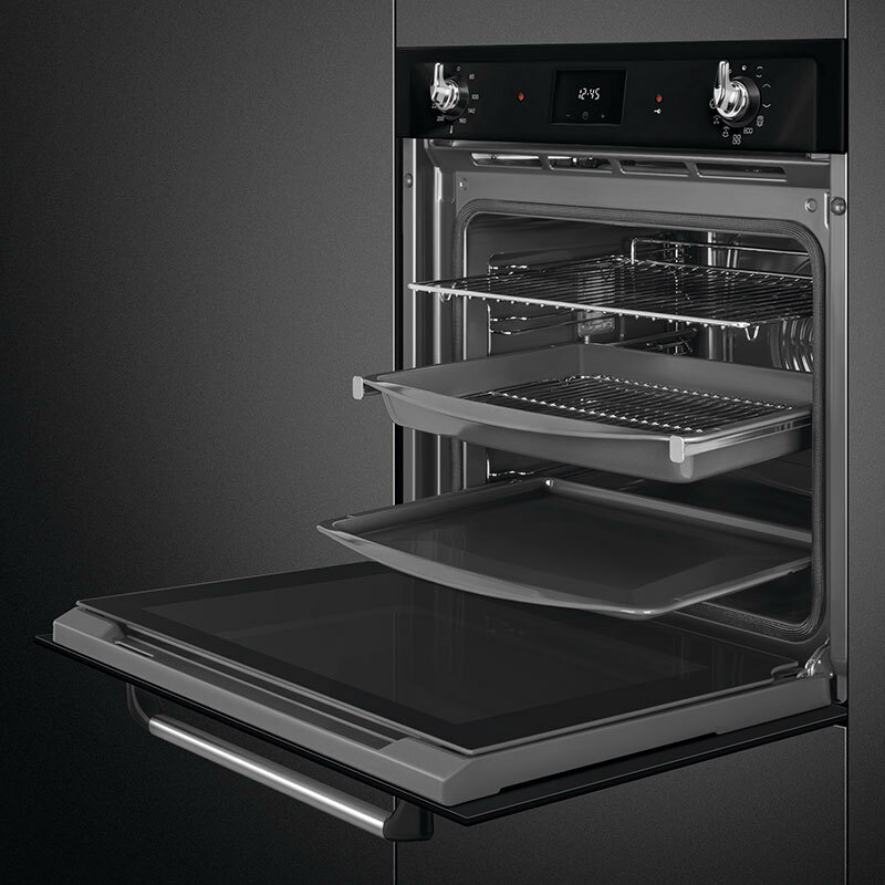 Horno empotrable Smeg SOP6900TN en acabado negro de 60 cm con cavidad de 68 L y termoventilación que ofrece 9 funciones de cocción. Incorpora control mediante mandos y display LED, limpieza pirolítica, precalentamiento rápido, puerta fría de 4 cristales, luz halógena y bloqueo para niños, garantizando eficacia y seguridad.
