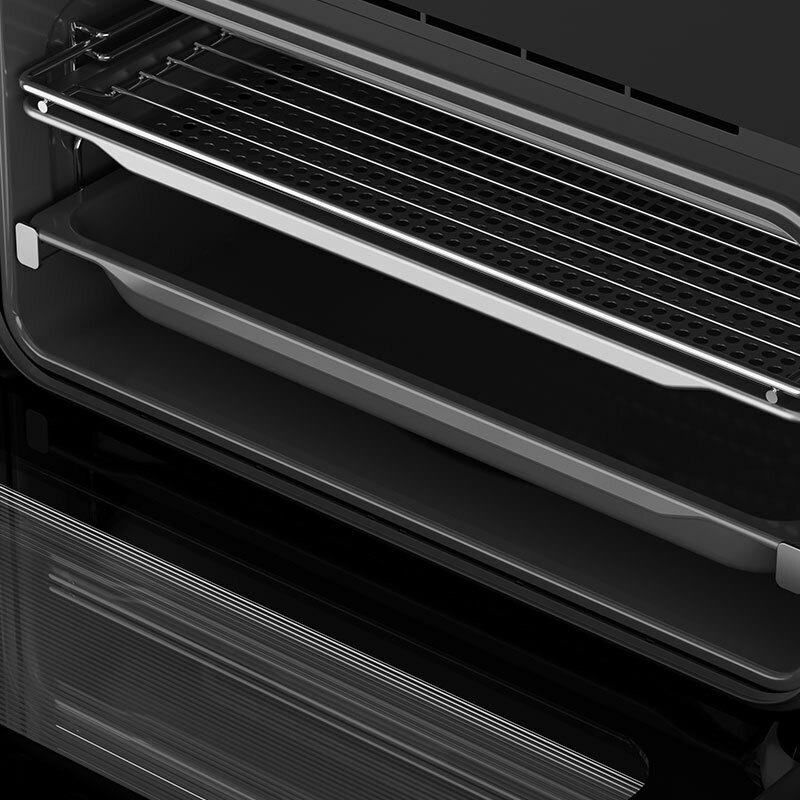 Horno compacto multifunción Teka HLC 8406 en cristal negro diseñado para integración. Ofrece 9 funciones de cocinado, sistema AirFry con bandeja FryMaster, limpieza HydroClean PRO y capacidad neta de 44 litros. Panel táctil con mandos, puerta de triple vidrio y eficiencia energética A+ para un uso eficiente y versátil.