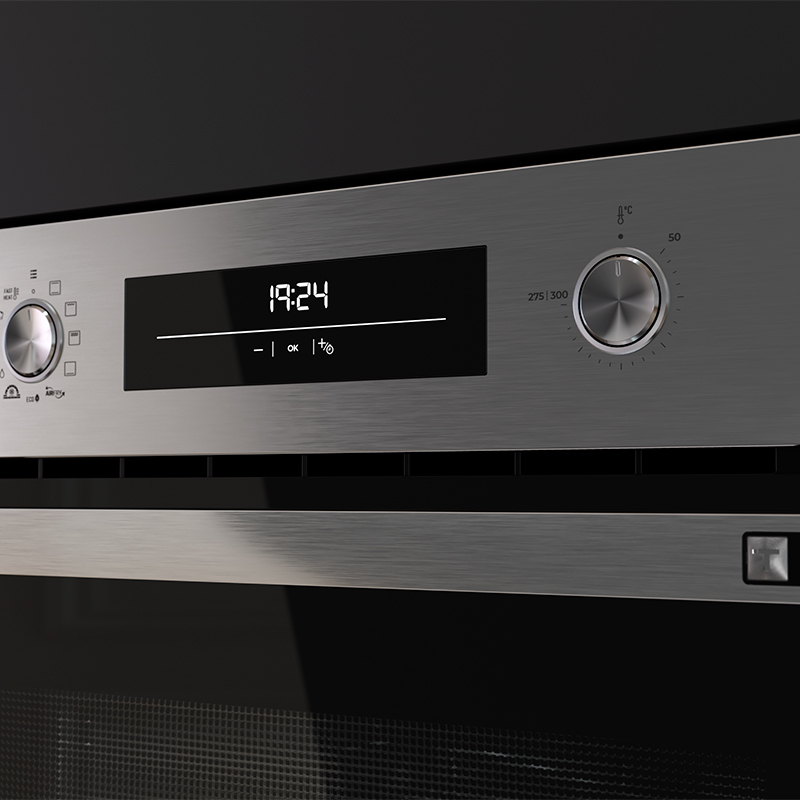 Horno pirolítico integrable de la serie Neo con 71 litros de capacidad y función AirFry que ofrece resultados crujientes con menos aceite. Incluye sistemas HydroClean y pirólisis para limpieza, hasta 300 °C, clasificación energética A+, mandos escamoteables, puerta de 3 cristales y bandeja FryMaster para cocinar sin aceite.