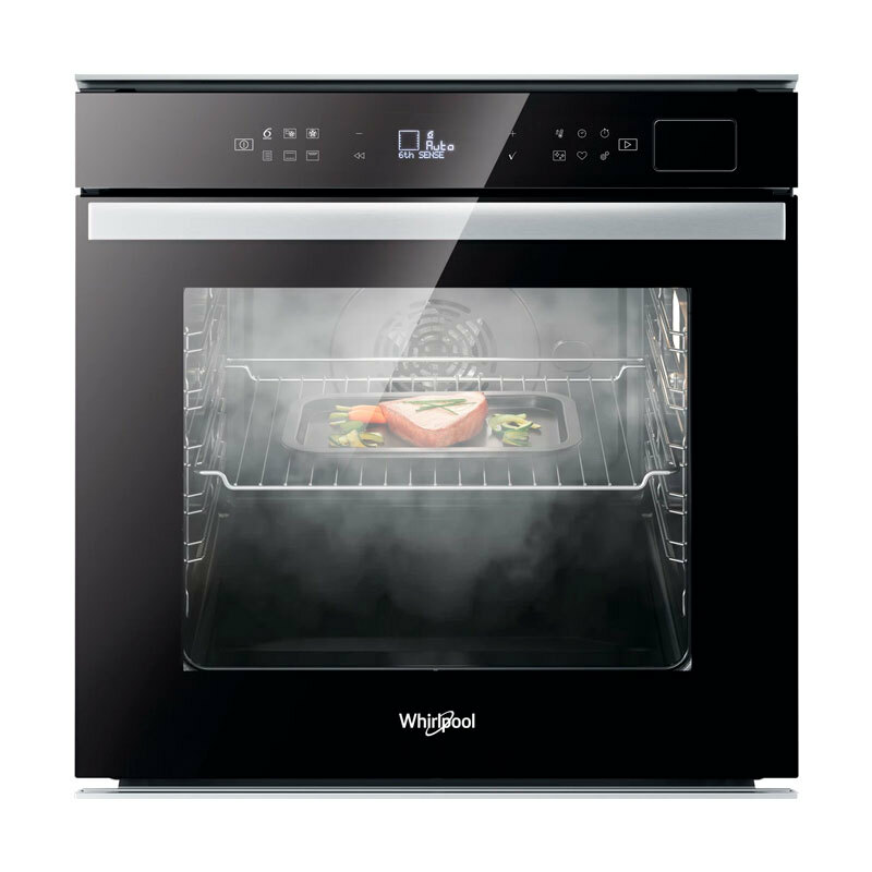 Horno integrable Whirlpool en cristal negro que ofrece 73 litros de capacidad y 20 funciones de cocción para resultados uniformes. Incorpora tecnologías 6th Sense y SteamSense, limpieza hidrolítica, control táctil con display asistido, guías telescópicas y puerta fría para mayor seguridad y confort.