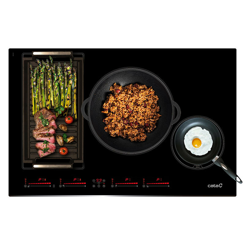 Placa de inducción Cata INSB 8021 BK/A de 80 cm diseñada para cocinas exigentes. Dispone de 4 zonas, incluida una zona modular flexible de 30,0 cm, potencia total 7.200 W y función Booster. Control Touch Slider con 9 niveles por zona, temporizador independiente, bloqueo infantil e indicador de calor residual.