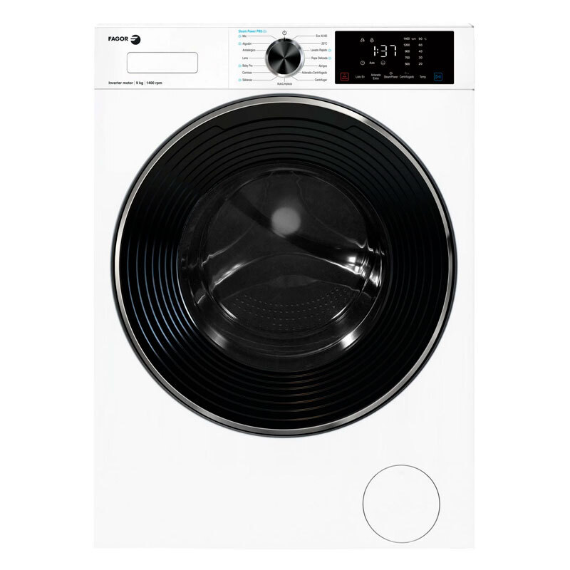 Lavadora de carga frontal Fagor 5FE-9714 con 9 kg de capacidad y centrifugado de 1.400 rpm. Diseñada para uso doméstico, ofrece eficiencia energética Clase A, múltiples programas (incluye vapor SteamPower Pro), motor BLDC y funciones de inicio diferido y bloqueo infantil para un lavado eficiente y seguro.