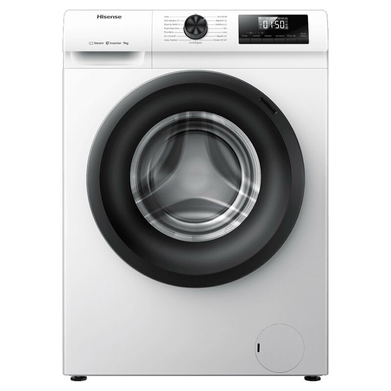Lavadora Hisense WF1Q9041BW de carga frontal con capacidad de 9 kg y centrifugado de hasta 1.400 rpm que combina eficiencia energética clase A con tecnología Inverter y función vapor para higiene. Incluye programas rápidos, Auto Wash, inicio diferido y bloqueo infantil, diseñada para instalación libre.