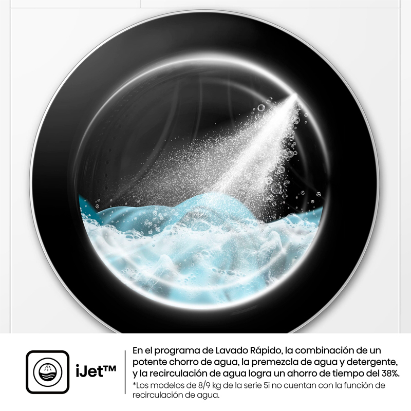 Lavadora de carga frontal Hisense WF5i9043BWFS con 9 kg de capacidad y centrifugado de 1.400 rpm, para libre instalación. Incluye pantalla TFT iPlay, conectividad Wi‑Fi, programas con vapor y antiácaros, función iJet para premezcla de detergente, fondo reducido iFit y tambor de 54 L, eficiencia energética clase A.