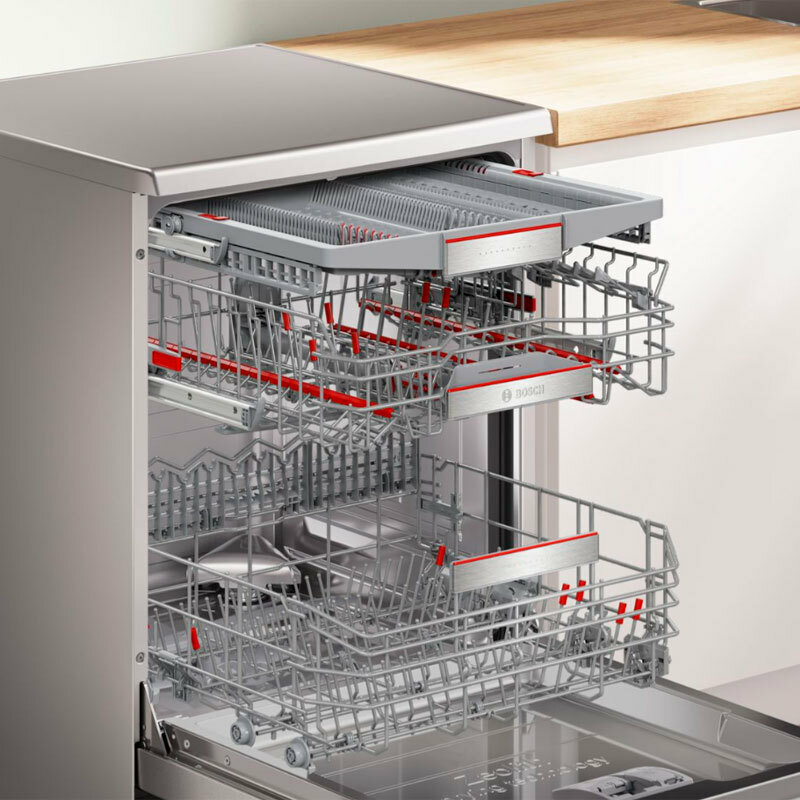 Lavavajillas de libre instalación Bosch Serie 8 diseñado para ofrecer eficiencia y flexibilidad en el lavado. Incorpora secado con zeolitas PerfectDry, cestas MaxFlex Pro y 3ª bandeja VarioDrawer Pro para mayor capacidad. Con conectividad Home Connect y sistema AquaStop para seguridad y control remoto.