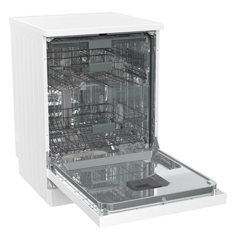Lavavajillas de libre instalación Hisense HS643C90W con capacidad para 16 servicios y 6 programas, diseño en color blanco y 3 niveles de lavado. Incluye tercera bandeja para cubiertos, secado extra con apertura automática de puerta y sistema AquaStop para mayor seguridad. Clase energética C y nivel de ruido de 44 dB.