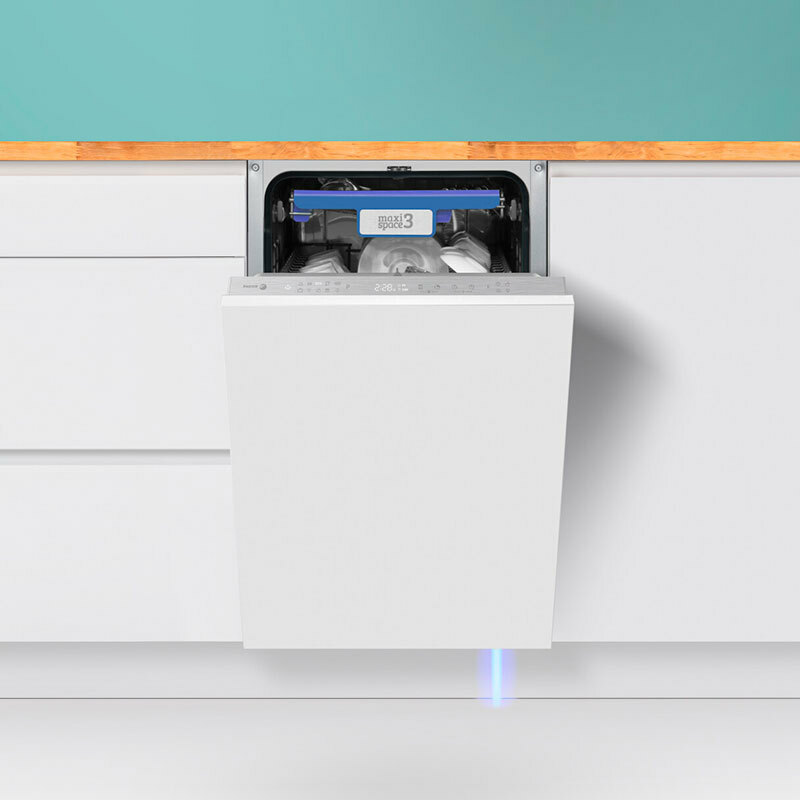 Lavavajillas integrable Fagor 4LVF438ADIT de 45 cm pensado para espacios reducidos. Capacidad 10 cubiertos y tercera bandeja MaxiSpace3 para cubiertos. Motor BLDC y AutoDoor para un secado eficiente, sistema AquaStop de protección frente a fugas, consumo ECO 8,5 L/ciclo y bajo nivel sonoro de 44 dB.