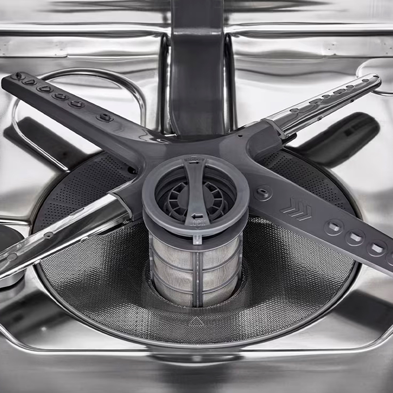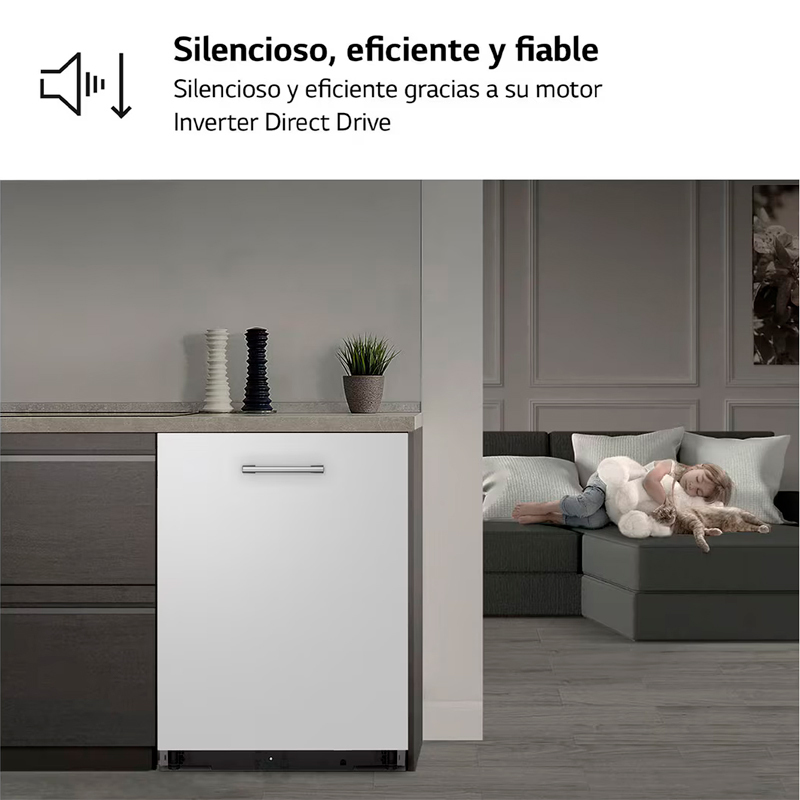 Lavavajillas integrable de 60 cm con capacidad para 14 servicios, motor Inverter Direct Drive y tecnologías TrueSteam y QuadWash que desincrustan la suciedad y reducen marcas de agua. Incluye 10 programas, tercera bandeja para cubiertos, secado por condensación, conectividad WiFi ThinQ, sistema AquaStop y bajo consumo energético clase A, con 43 dB de ruido.