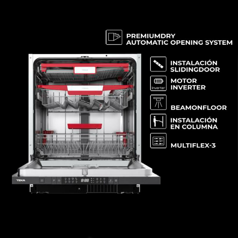 Lavavajillas integrable Teka DFI 76960 de 60 cm con capacidad para 14 cubiertos, motor inverter y tercera bandeja MultiFlex3. Dispone de apertura automática PremiumDry, 8 programas y 5 temperaturas, bajo consumo de agua y sistema de seguridad AquaStop para protección contra fugas, ofreciendo alto rendimiento y confort en la cocina.