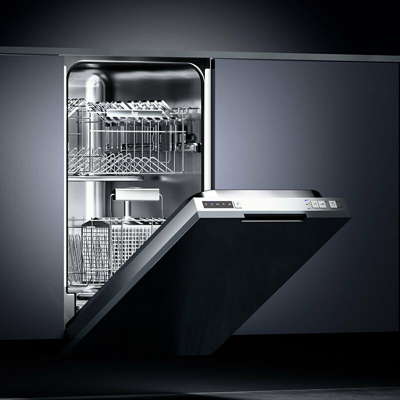 Lavavajillas integrable Teka DW8 40 FI de 45 cm diseñado para espacios reducidos. Capacidad para 9 servicios con cinco programas y cuatro temperaturas (45–65 °C). Incluye función media carga, inicio diferido 3-6-9 h y sistema AquaStop Total para protección contra fugas. Consumo 9 L/ciclo y bajo nivel sonoro, cesto superior regulable y secado eficaz por condensación.