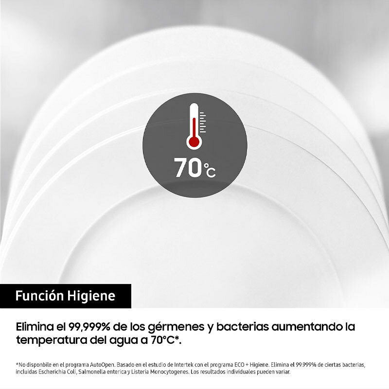 Lavavajillas de libre instalación Samsung DW60A6092FS/ET de 60 cm con capacidad para 14 servicios, diseñado para ofrecer limpieza y secado eficiente mediante apertura automática de puerta. Clase D y consumo eficiente de agua y energía, siete programas y función Higiene hasta 70 °C para mayor desinfección.
