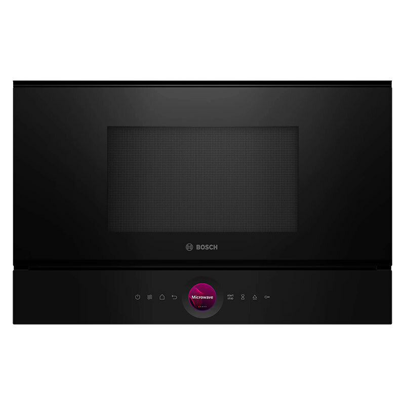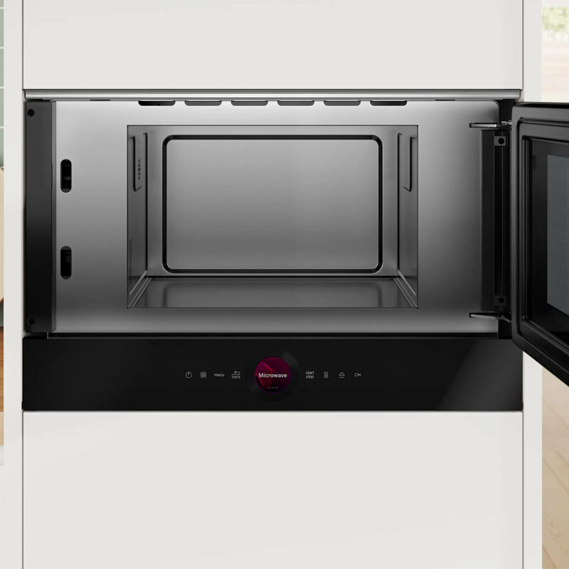 Microondas integrable Bosch BFR7221B1 de diseño negro y 21 litros pensado para cocinas modernas. Incorpora tecnología Inverter para calentado homogéneo, control táctil TFT con anillo digital, asistente de limpieza con agua y 7 programas automáticos que facilitan su uso y mantenimiento.