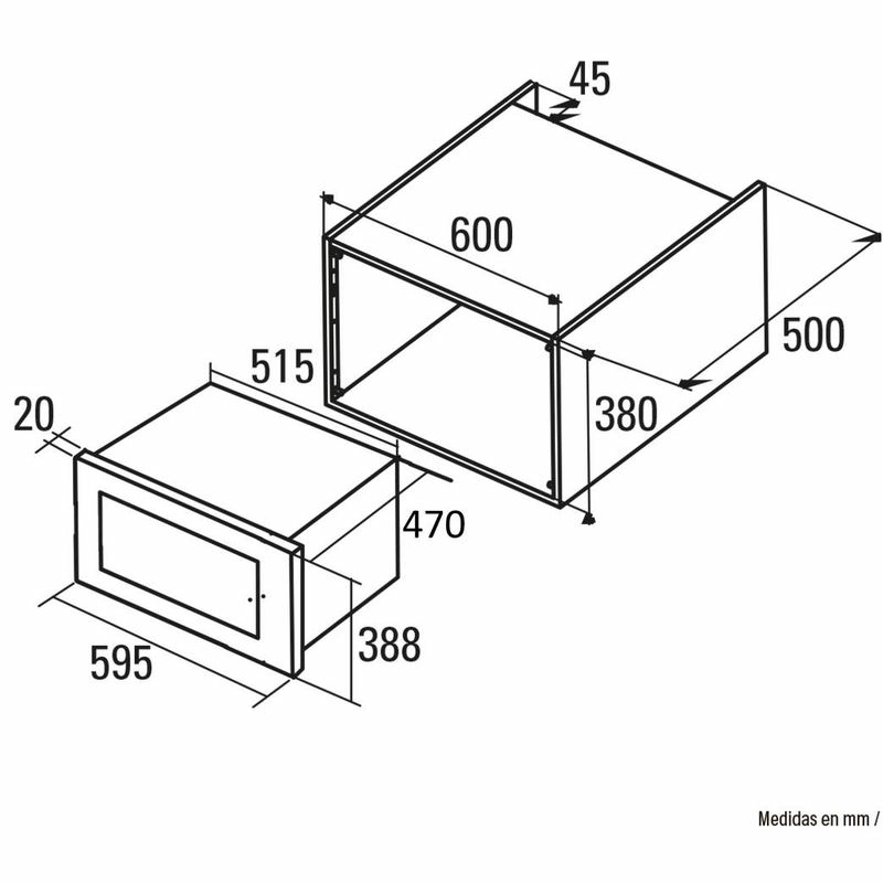 Microondas integrable CATA MC 32 DC de 32 litros diseñado para encastre en mueble de 60 cm. Combina microondas, grill de 1.100 W y convección, con 900 W de potencia en microondas, pantalla LCD y 10 programas automáticos. Interior en acero inoxidable, plato giratorio Ø31,5 cm y bloqueo infantil para mayor seguridad y facilidad de uso.