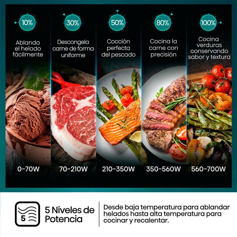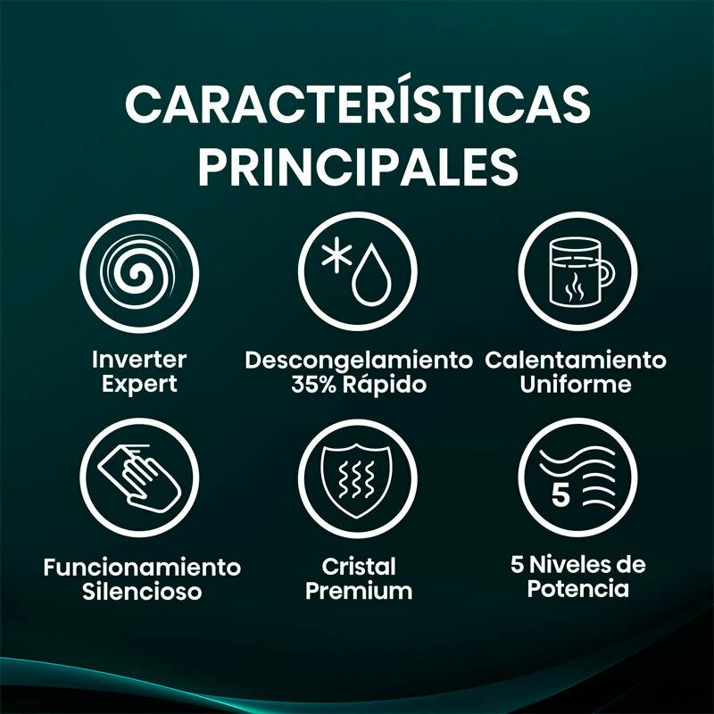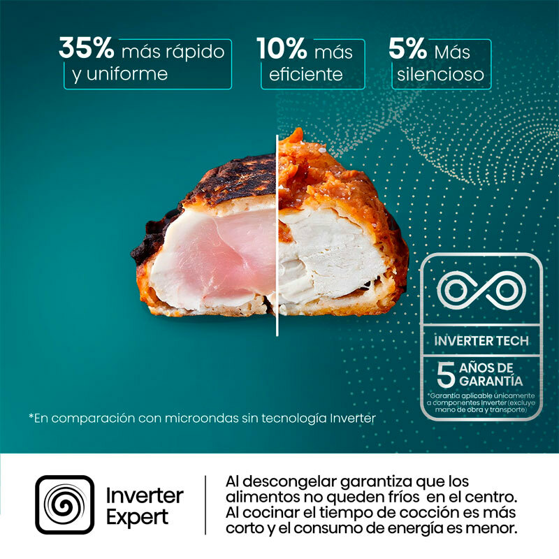 Microondas de uso doméstico con capacidad de 20 litros y tecnología Inverter que garantiza calentamiento uniforme y funcionamiento silencioso. Ofrece 700 W de potencia, 5 niveles de potencia, plato giratorio de 25,5 cm y función de descongelación rápida. Diseño compacto y bloqueo infantil para mayor seguridad.