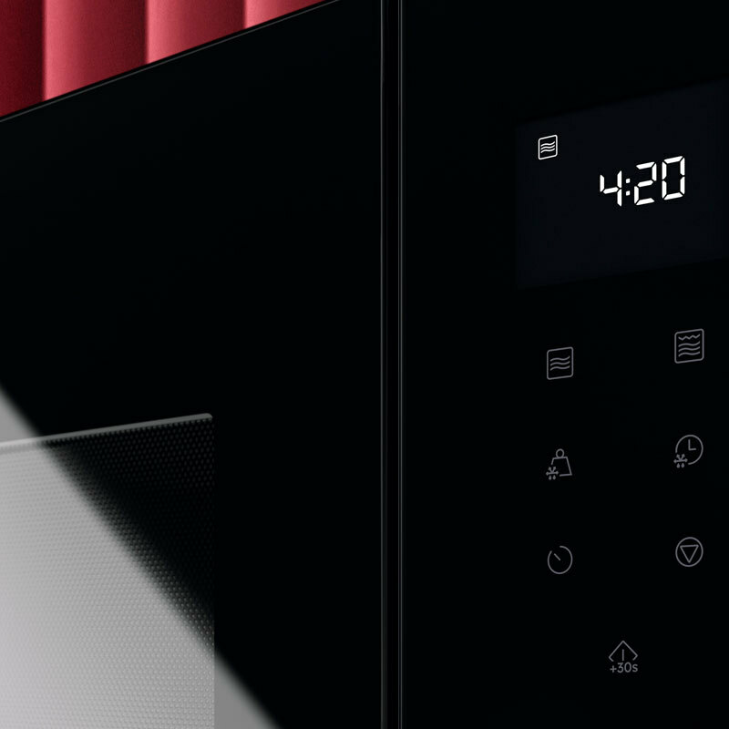 Microondas integrable AEG OS5MG20EB Serie 5000 con capacidad de 20 litros y 800 W de potencia, equipado con grill de 1.000 W para dorar y acabado crujiente. Panel con display LCD y mandos combinados para manejo sencillo. Cavidad de acero inoxidable, plato giratorio de 25,5 cm y funciones de descongelado por peso, programas automáticos y bloqueo infantil que garantizan seguridad y versatilidad en la cocina.