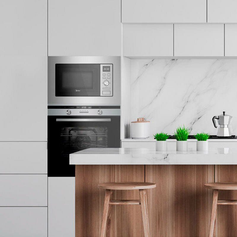 Microondas integrable Midea MBMAG720A-X de 17 litros diseñado para encastre en muebles con fondo de 30 cm. Ofrece 700 W de microondas y grill de 1050 W, 8 menús automáticos, descongelación por peso o tiempo y plato giratorio de 24,5 cm. Interior en acero inoxidable, control digital con mando giratorio, bloqueo de seguridad y temporizador hasta 95 minutos para un uso seguro y versátil.