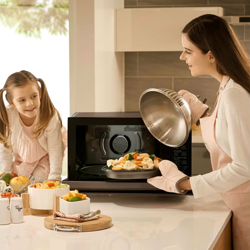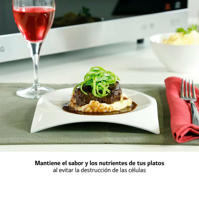 Microondas LG MJ3965BPS de 39 litros con tecnología Smart Inverter y función Air Fry que combina microondas, grill y convección para una cocción uniforme y más rápida. Incluye revestimiento EasyClean, pantalla LED, control giratorio y táctil, bloqueo infantil y plato giratorio de 36 cm.
