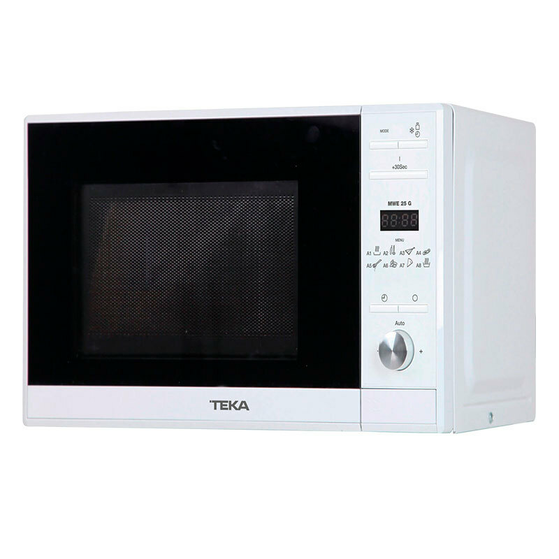 Microondas Teka MWE225G en color blanco diseñado para libre instalación con 20 litros de capacidad. Panel de mandos electrónico con 8 programas automáticos, grill de 1.000 W y potencia microondas de 700 W para calentar, dorar y descongelar con eficacia. Incluye plato giratorio de 25,5 cm, bloqueo infantil y temporizador hasta 95 minutos que facilitan su uso y seguridad.