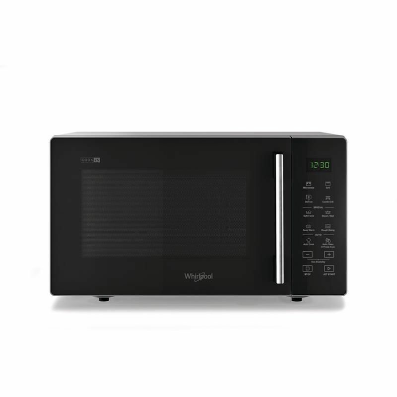 Microondas Whirlpool MWP254SB de libre instalación con 25 litros de capacidad, 900 W de potencia en microondas y 1000 W en función grill. Panel táctil con display digital, 14 programas automáticos y 7 niveles de potencia. Incluye descongelado, bloqueo infantil y plato giratorio de 27,0 cm. Dimensiones 48,3 x 28,1 x 41,9 cm y cavidad esmaltada para limpieza sencilla. Acabado negro elegante indicado para cocinas modernas.
