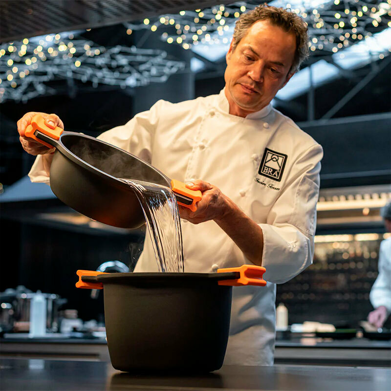 La olla alta Bra Efficient 28 cm ofrece 11,1 L de capacidad y cuerpo de aluminio fundido con base de 6 mm para mayor estabilidad. Revestimiento Teflon Platinum Plus libre de PFOA proporciona antiadherencia duradera. Fondo full induction compatible con todas las cocinas. Incluye tapa de vidrio y asas de silicona desmontables; apta para lavavajillas y horno hasta 220 °C.