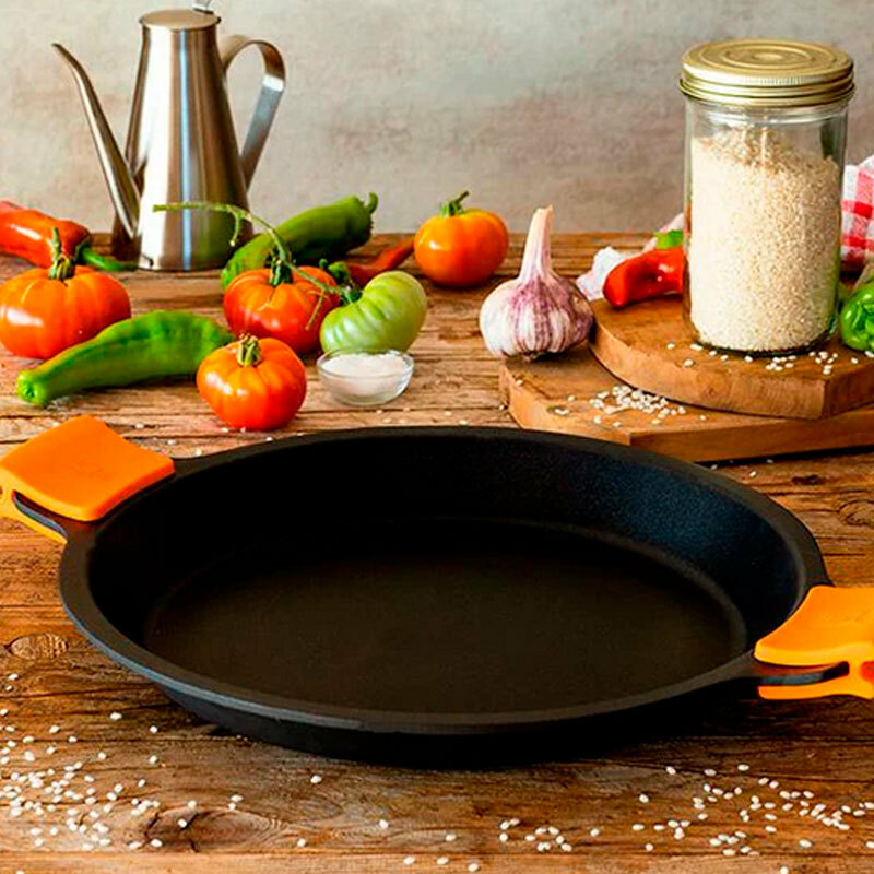 Paellera BRA Efficient de 40 cm diseñada para uso intensivo, fabricada en aluminio fundido con base de 6 mm para alta resistencia y reparto térmico uniforme. Cuenta con recubrimiento antiadherente Teflon Platinum Plus libre de PFOA, asas de silicona desmontables y fondo full induction apto para todas las placas y horno hasta 220 ºC