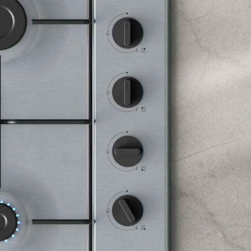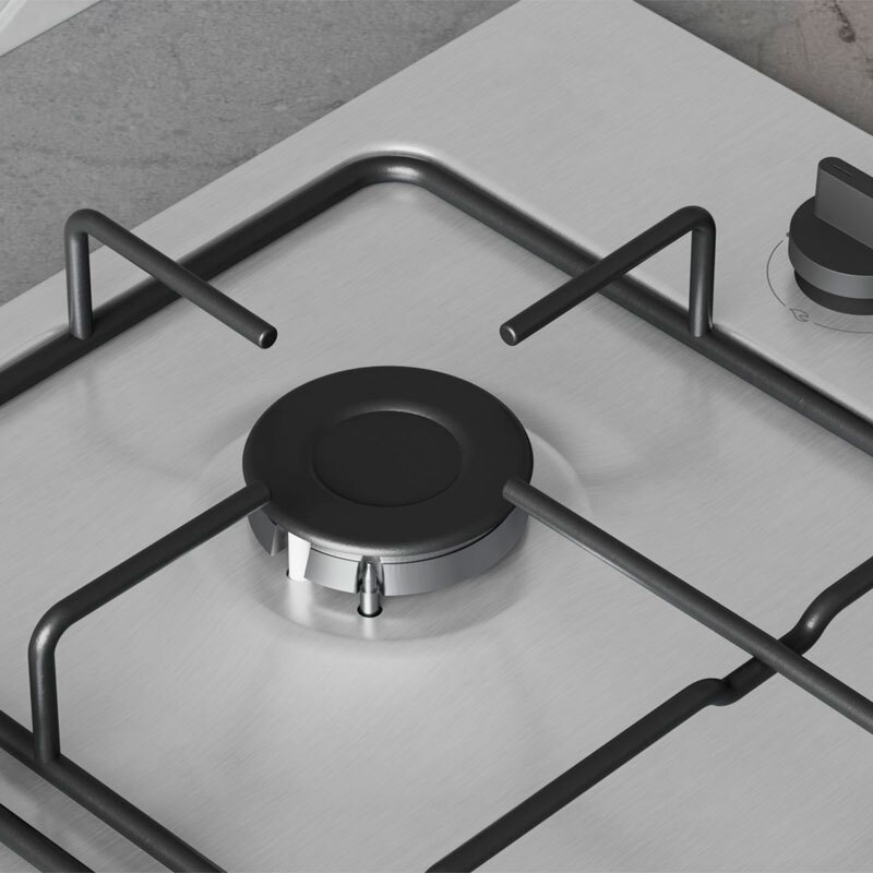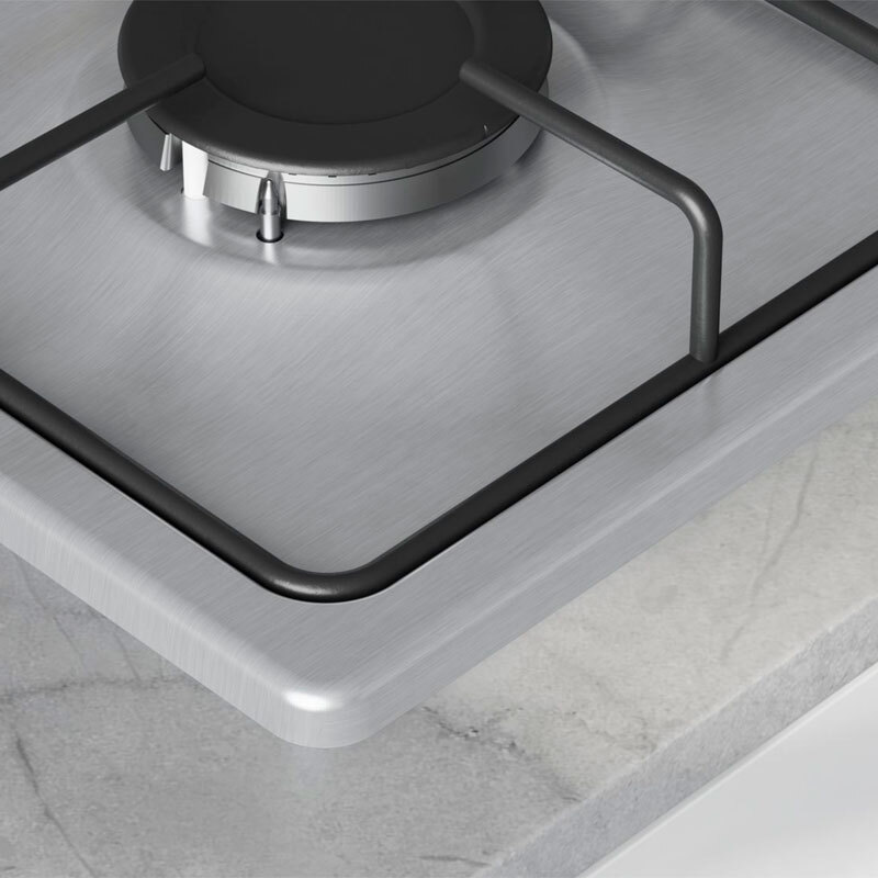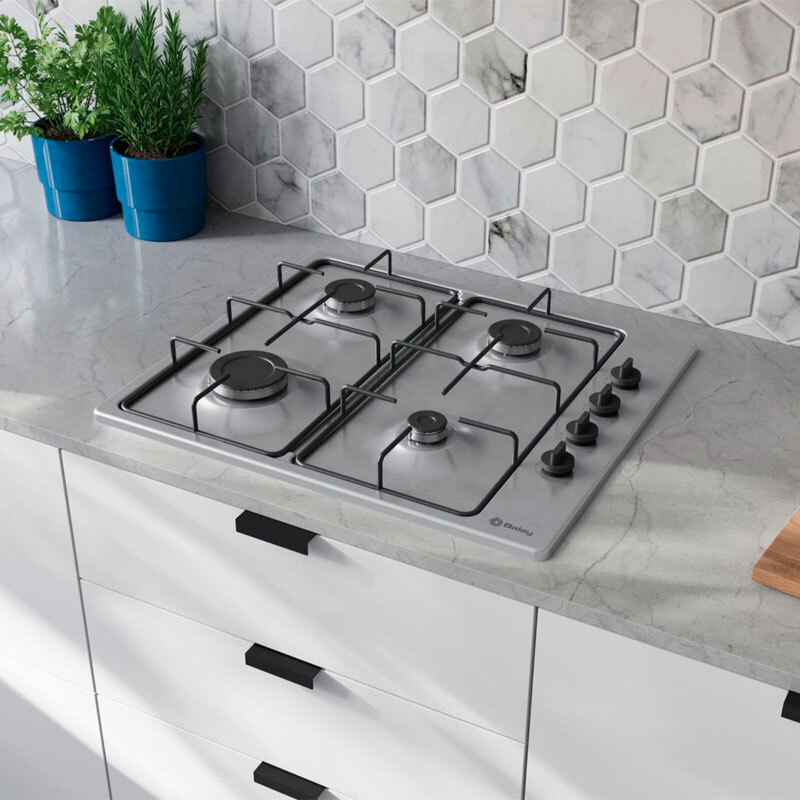 Placa de gas Balay de 60 cm en acabado acero inoxidable que combina robustez y limpieza sencilla con altas prestaciones de cocción. Dispone de cuatro fuegos de distintas potencias, sistema de seguridad GasStop, autoencendido en mandos y parrillas metálicas continuas para mayor estabilidad.