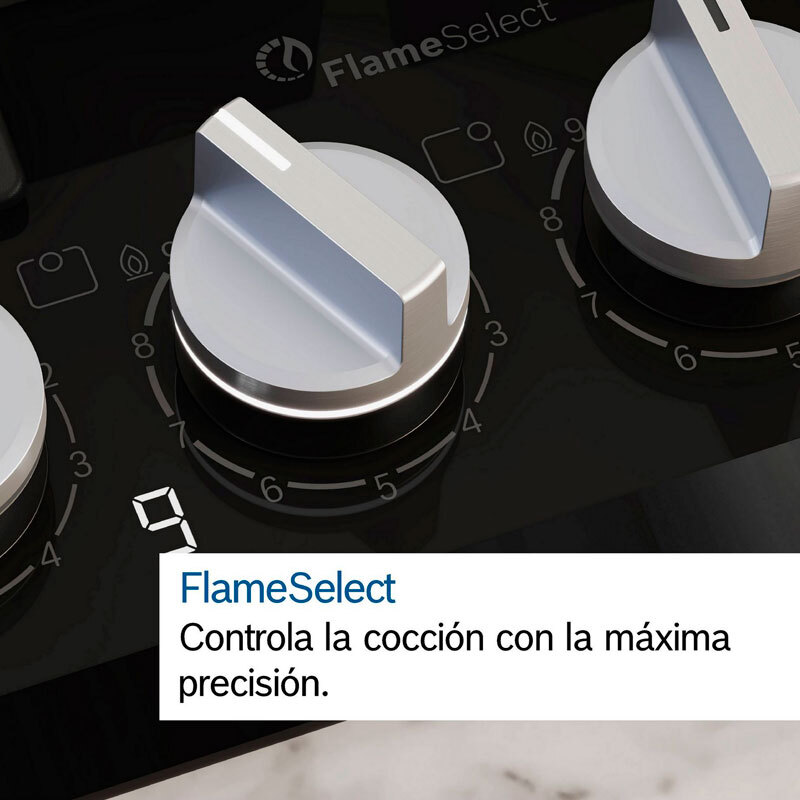 Placa de gas Bosch PCR9A5I90 de 90 cm en acero inoxidable para instalación encastrada. Dispone de cinco quemadores incluyendo un quemador wok de alta potencia, FlameSelect con 9 niveles para control preciso, parrillas de hierro fundido aptas para lavavajillas y sistema GasStop que corta el suministro en caso de apagado accidental. Mandos extraíbles y acabado sin marco para una integración fácil y limpieza cómoda. Preparada para gas natural con kit de inyectores para gas alternativo.