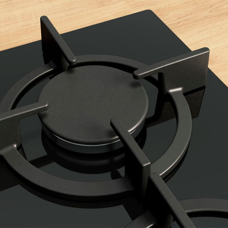Placa de gas Bosch PPC6A6I10 de 60 cm con superficie de vidrio templado negro y mandos metálicos frontales. Incorpora FlameSelect de 9 niveles para un control preciso, sistema GasStop para seguridad y parrillas de hierro fundido aptas para lavavajillas. Instalación enrasada o sobre encimera.