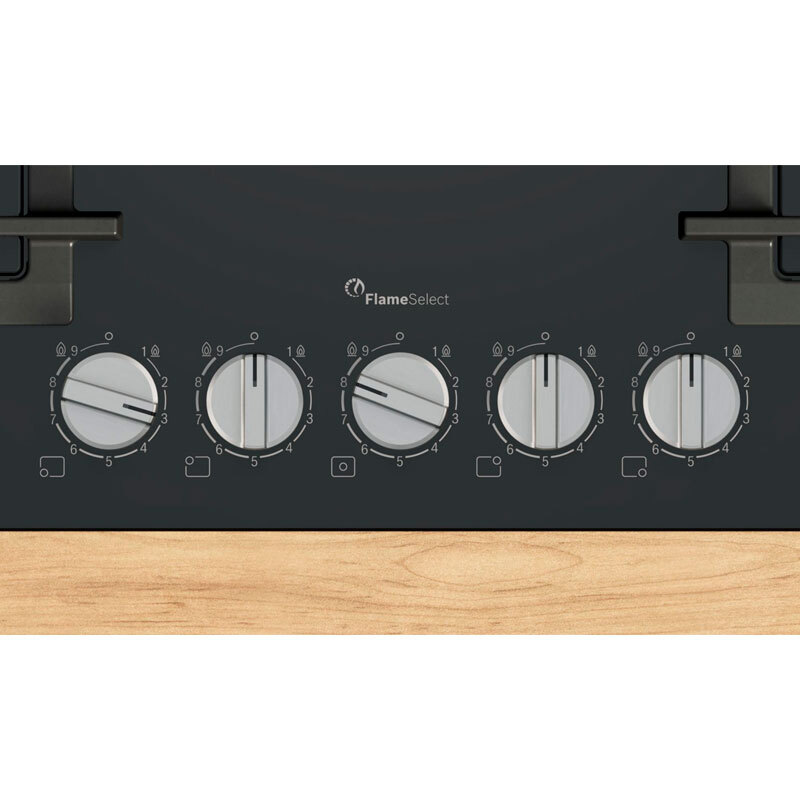 Placa de gas Bosch PPQ7A6I40 – 5 zonas, Cristal templado negro, FlameSelect 9 niveles
